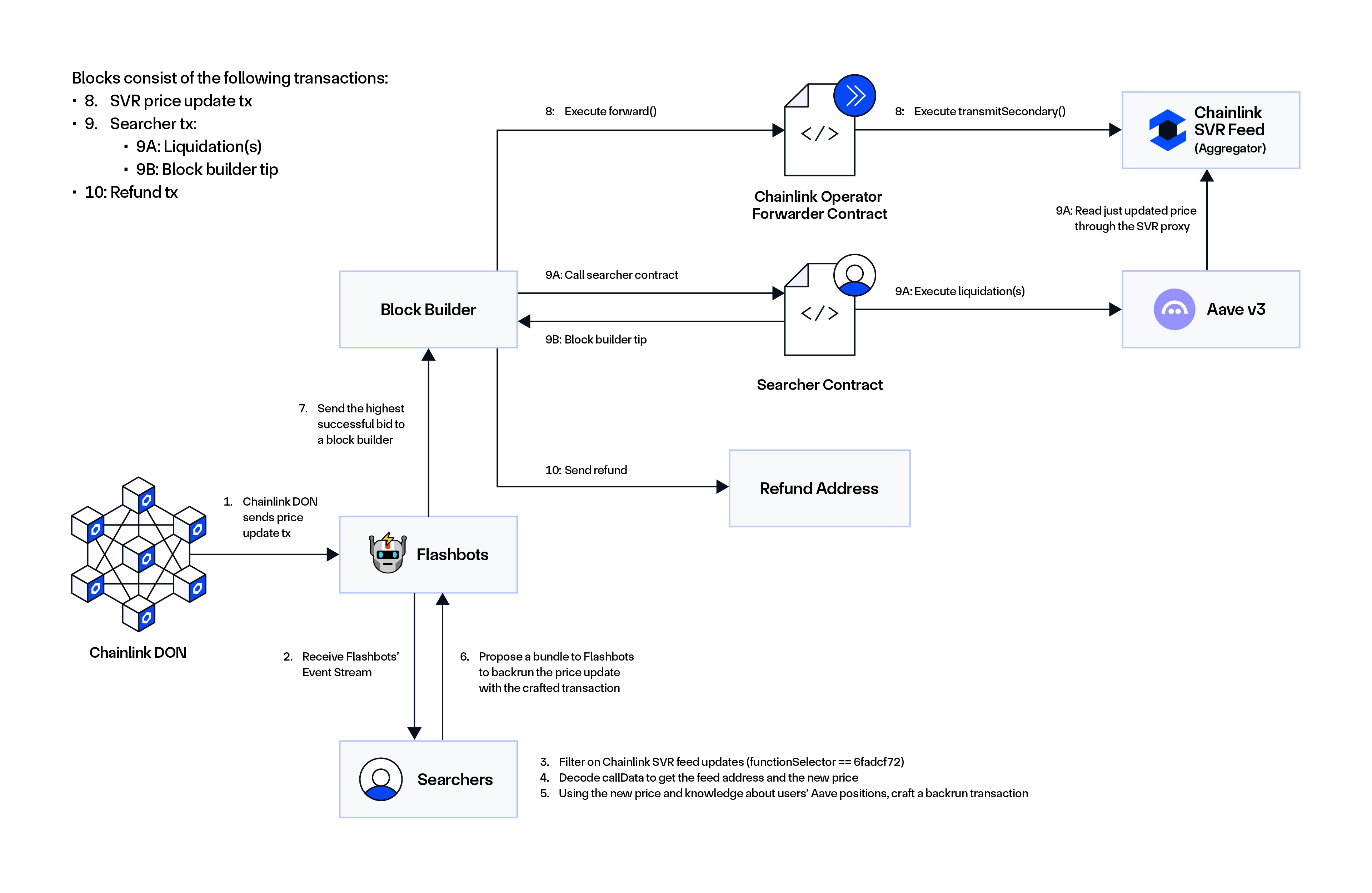 Traditional MEV searching depends on spotting oracle price updates in the public mempool. With SVR, new price reports are shared in a private mempool via Flashbots MEV-Share. Searchers place bids to include liquidation transactions directly after the price update in the same block. The highest bidder gets included, capturing the liquidation bonus while sharing part of the winning bid with the DeFi protocol (e.g., Aave) and the Chainlink Network.